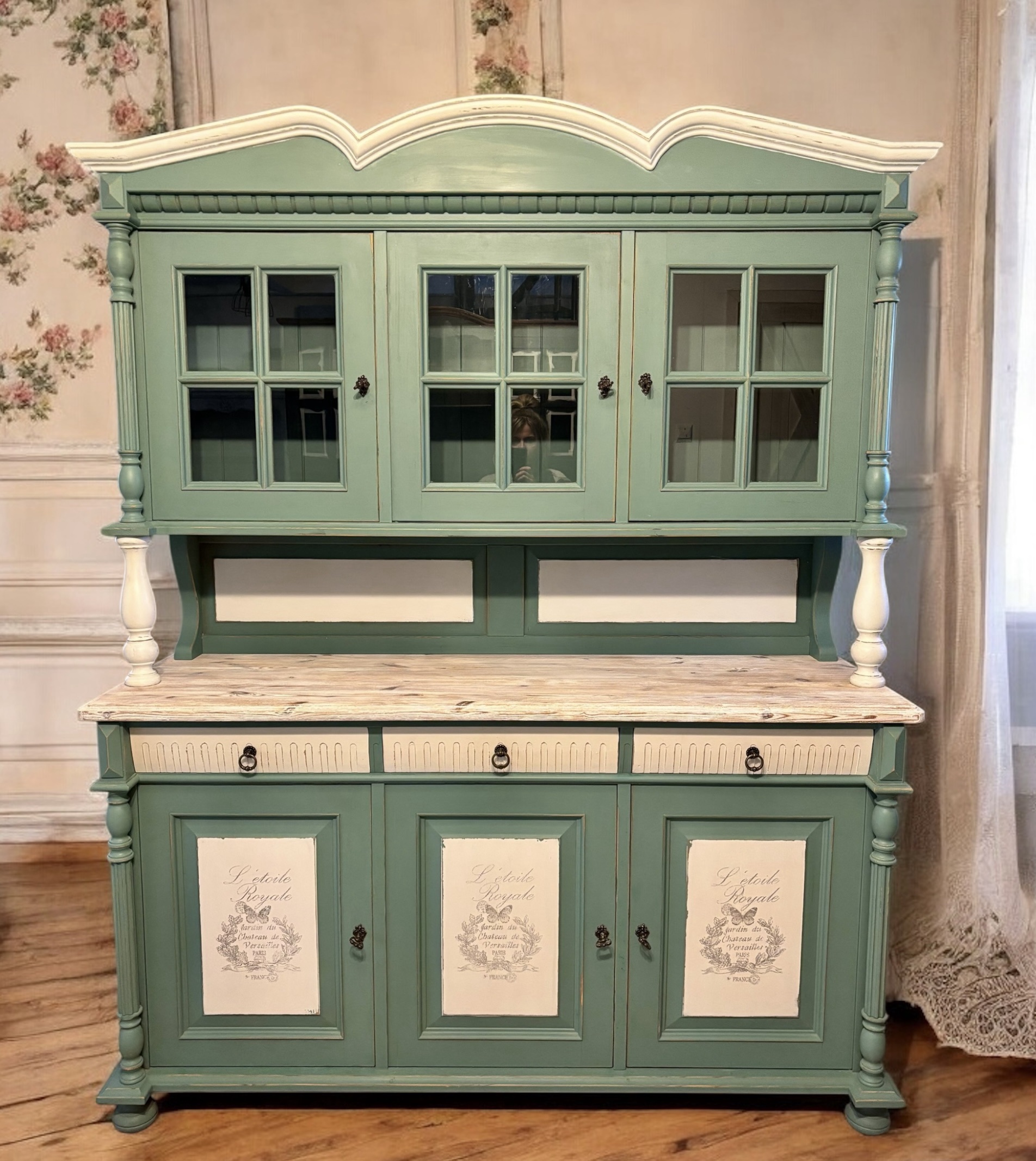 Ten kredens nie powstał w fabryce. Nie jest idealny – i właśnie w tym tkwi jego siła. To mebel, który oddycha historią drewna. Każdy jego centymetr został ręcznie malowany i stylizowany w pracowni Ma Maison, z dbałością o charakter, nie o perfekcję.