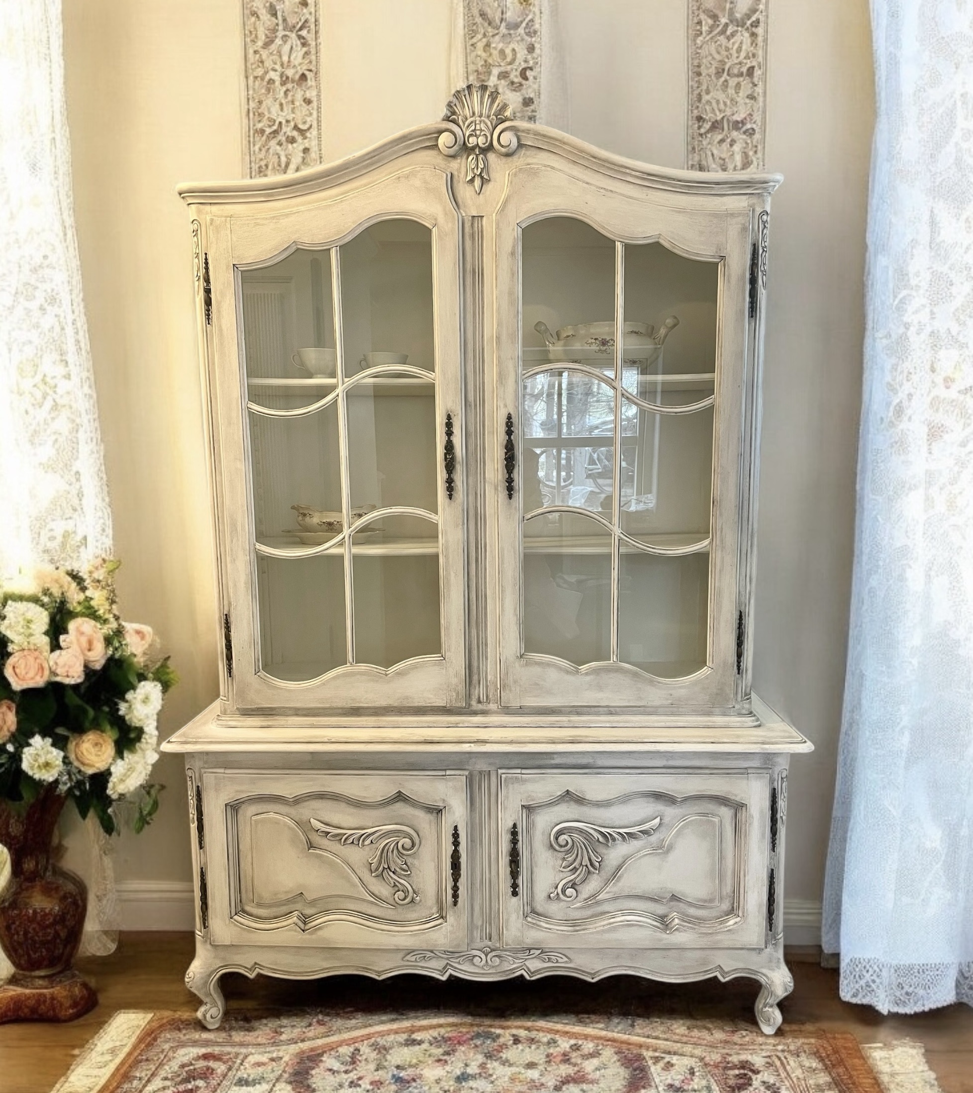 Biały kolor wykończenia, który został delikatnie poprzecierany jest idealny do wnętrz vintage i shabby chic. Czarna grafika idealnie współgra z czarnymi okuciami.